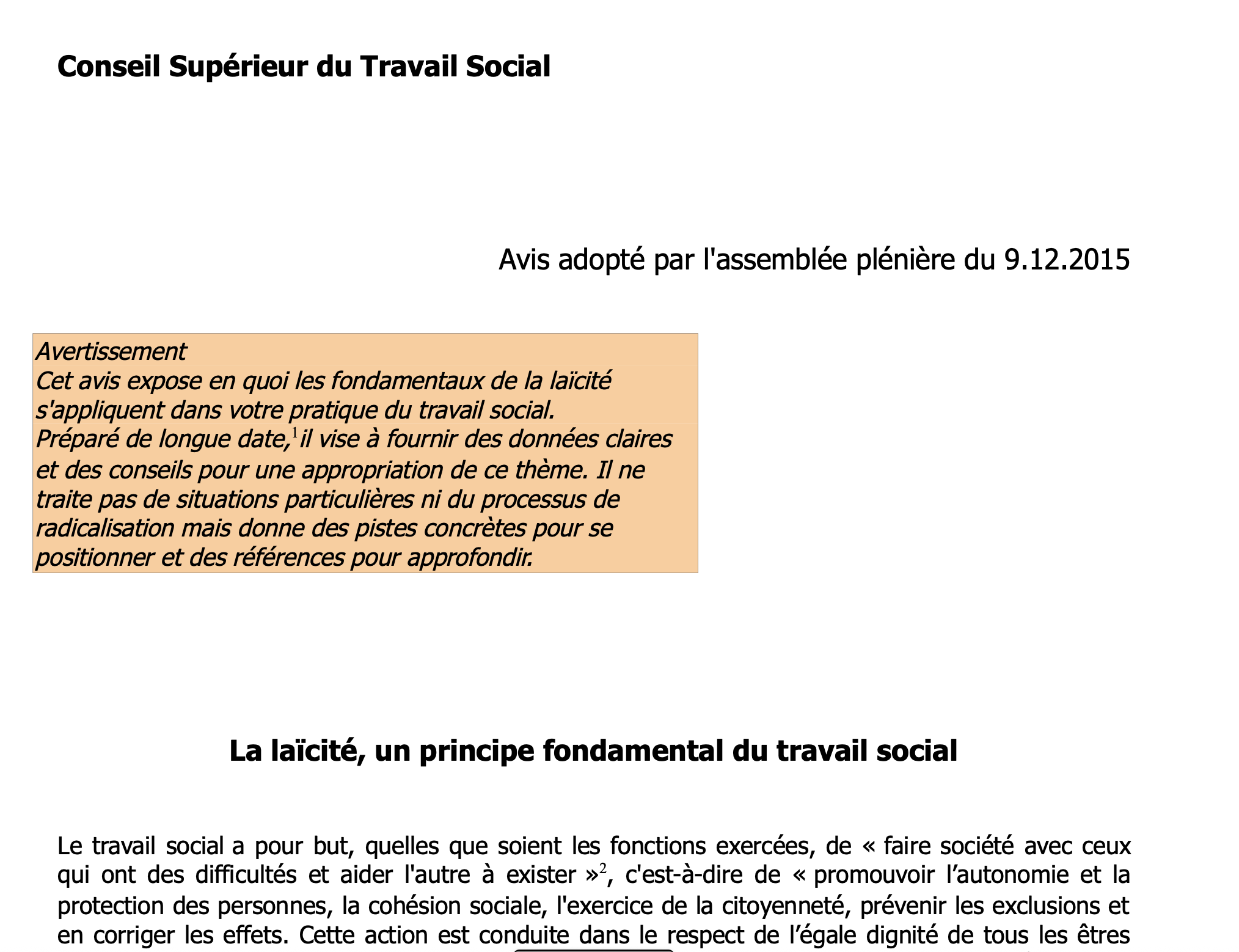 Avis Conseil Supérieur du Travail Social – Laïcité, un principe du travail social (10-12-15)